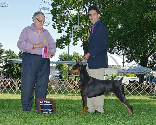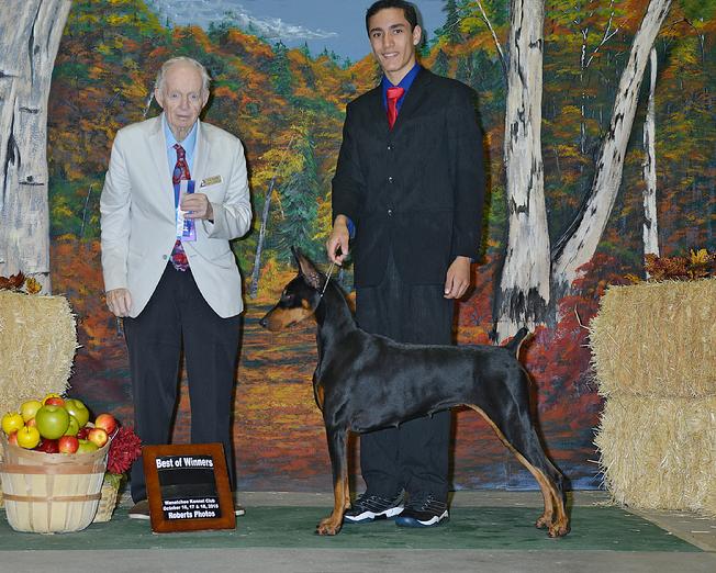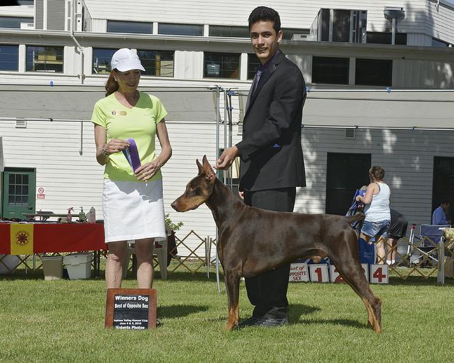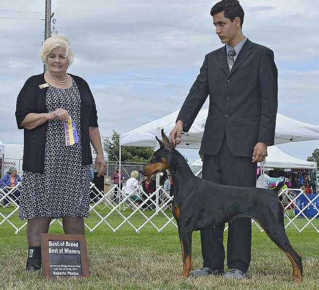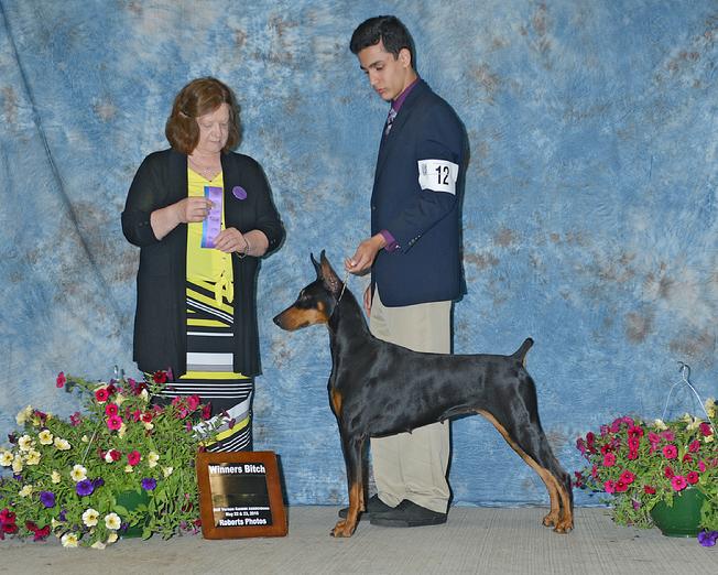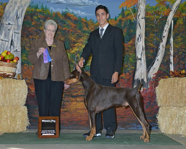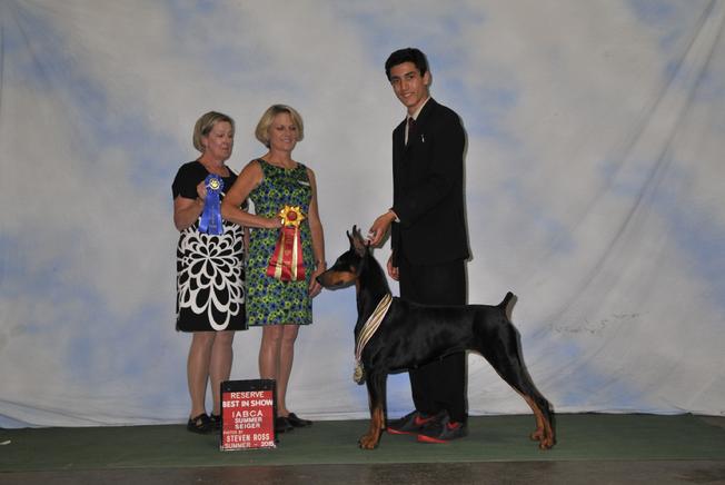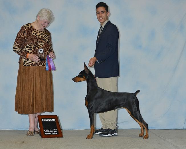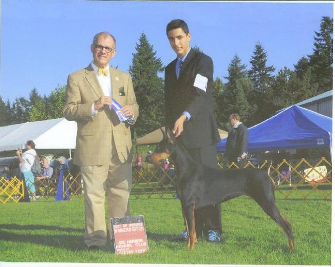 Gabe has lived with Dobermans all his life. Curently he shows two dogs, Atty a black female and JR a red male.